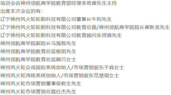 本次代理商培訓(xùn)會(huì)的明星導(dǎo)師10余位,將陪伴大家共同度過(guò)這三天兩夜。本次培訓(xùn)會(huì)旨在為新晉代理商伙伴闡述神州風(fēng)火輪企業(yè)文化、樹立整體市場(chǎng)觀念、規(guī)范營(yíng)銷制度、拓展?fàn)I銷思路。